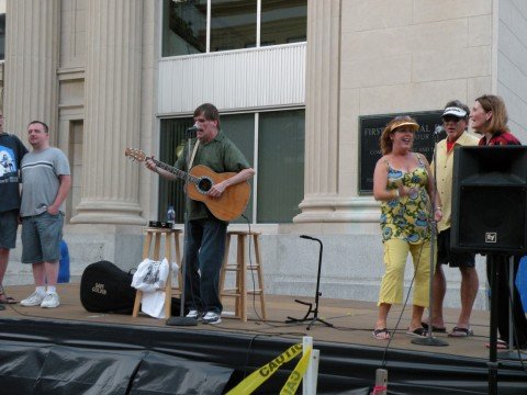 My favorite year was 2010. They had moved the stage from in front of The Arts Council building to over by The Avon Theater. It seemed more wide open – folks could sit on the grass or at the couple of picnic tables. The stage had a little shade roofing it had not had before. The temperature was warm but not hot as it was the other years.