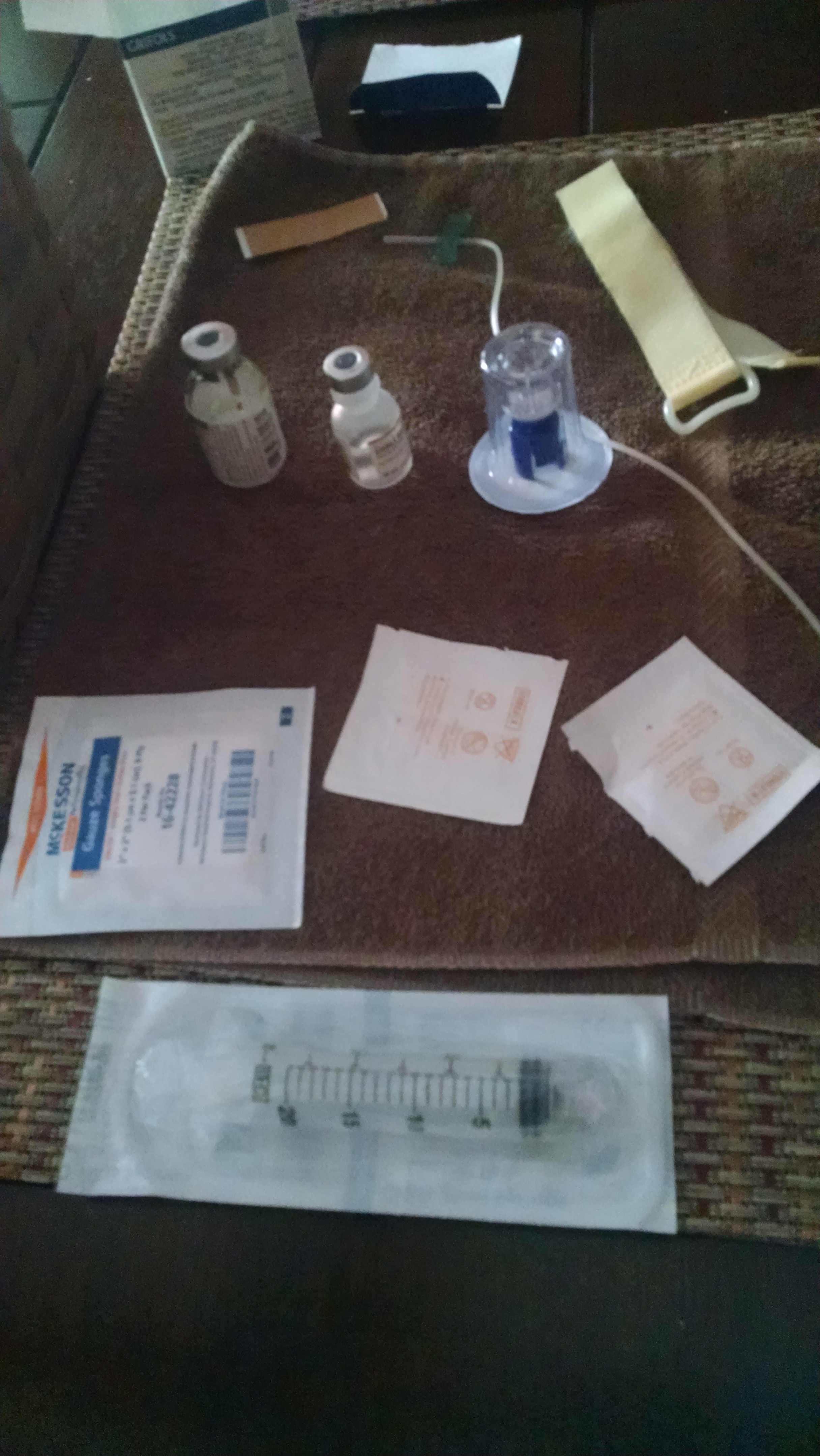 Having removed the blue end of the transfer device, I draw the liquid up into a 20ml syringe. After tapping out air bubbles created in the transfer, I tighten the tourniquet around my forearm, clean the surface of my hand with an alcohol swab, then start the IV with a 23 gauge butterfly needle.