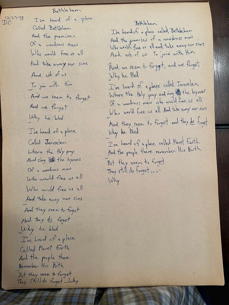 I recently found the original lyric sheet from the day I wrote the song in 1975! The original title was “Bethlehem”.In rewriting the lyric, I changed the title to “We Forget Why” which I felt made more sense. The song was about Jesus’ journey, not only about Bethlehem. The original lyric 3rd verse sought to basically rhyme the word “Earth” with “birth”. I felt that to complete the story from Bethlehem to Jerusalem, the 3rd verse needed to go to where his Earthly life ended hence Gethsemane! Full new lyric can be found down below!